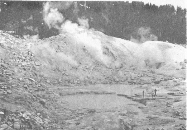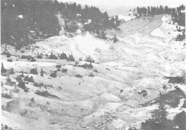 5 SULPHUR WORKS is the most easily accessible hydrothermal area in the Park. It is probably part of the central vent system of ancient Mt. Tehama which is described at No. 7. A short paved trail leads to the sputtering hot springs, steaming fumeroles and hot bubbling mud pots. For your own safety be sure to stay on the trails in any of the thermal areas. Slippery clay and thin crusty coverings could lead to a dunking in scalding hot water and mud. Most water in the thermal areas of the Park contain sulphurous or sulphuric acid, so avoid getting it on your clothes. The odor is mainly that of hydrogen sulphide. Much of the white clay is tinted yellow, tan or pink by mineral impurities, chiefly iron oxides.