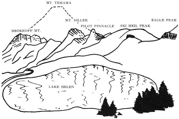 21 Scenic view of LAKE HELEN and the western half of the REMNANTS OF COLLAPSED MT. TEHAMA. This ancestral mountain, a composite or strato-type volcano, was destroyed during the Ice Age in much the same manner as Mt. Mazama, which collapsed to form 2,000 foot deep Crater Lake. Brokeoff Mt., Mt. Diller, and Pilot Pinnacle to the south and west are remnants of Mt. Tehama.