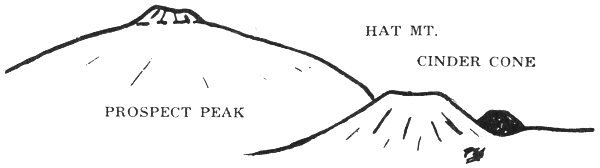 59 PROSPECT PEAKS are Hawaiian or shield volcanos made of countless thin basaltic lava flows from a central vent, producing shield-shaped outlines. The sharp peaks on top of these two mountains are small cinder cones. Badger Mountain is a plug volcano like Chaos Crags or Lassen Peak. West Peak is outside the park 30 and on it is a Forest Service fire look-out station. To the north and northeast are typical virgin forests mantling a sea of minor volcanic peaks.