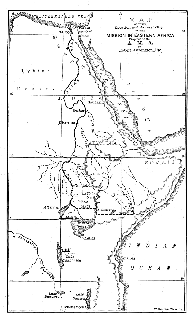 From the information gathered, they conclude that though there are difficulties, there are no insurmountable obstacles in the way of the establishment of the mission proposed. The country has been visited by a number of explorers, merchants and officers of the Egyptian Government. Steamers ply up and down the Nile in close proximity to some of the tribes it is proposed to reach. Sir Samuel Baker has illustrated the feasibility of conveying steel steamers in sections across the desert, from Souakim on the Red Sea, to Berber on the Nile, at which point they can be reconstructed and used on the Nile and its tributaries. With a small screw steamer, a missionary expedition can explore the different portions of the country mentioned by Mr. Arthington, using the boat for storage of supplies, and as a mission house, until stations can be established.