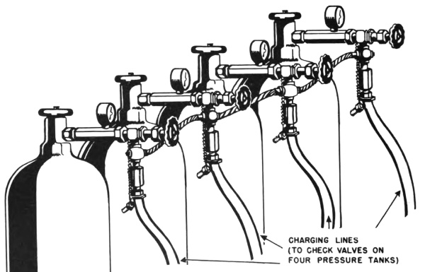 Figure 23. Charging two pressure tanks, using charging and filling lines, and cylinders of compressed air or nitrogen. As many as four pressure tank and valve assemblies, on or off tank groups, can be charged at one time from cylinders coupled as shown in figure 24.