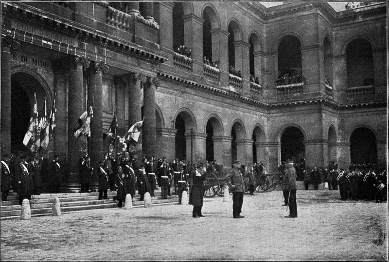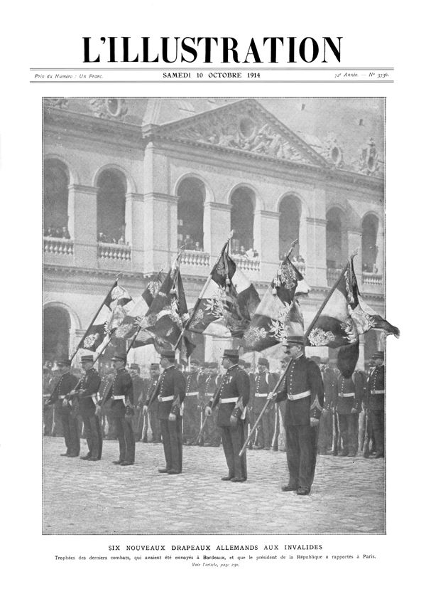 En quittant Bordeaux, M. Poincaré avait emporté avec lui les six étendards allemands pris récemment à l’ennemi et les avait fait déposer à l’Elysée. Mercredi dernier, ils ont été transportés par une compagnie de la garde républicaine à l’Hôtel des Invalides. Chaque drapeau allemand était porté sur l’épaule, l’étoffe pendant vers le sol, par un sous-officier. Dans la cour d’honneur, le général Niox, commandant des Invalides, reçut les trophées, qui, remis aux vieux soldats aux moustaches blanches, furent transportés par eux dans la chapelle.
