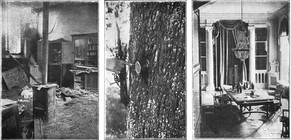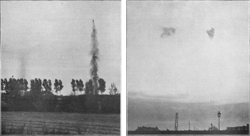 La seconde de nos photographies, prise le 4 octobre, au moment où les Allemands bombardaient les forts d’Anvers avec un redoublement d’énergie, montre le flocon de fumée grise, curieusement déchiqueté, que produisent les shrapnells alors qu’ils explosent à 50 ou 100 mètres au-dessus du sol en projetant en cône, comme une pomme d’arrosoir, une pluie de balles sphériques qui rappellent, par leur grosseur, les billes des écoliers.