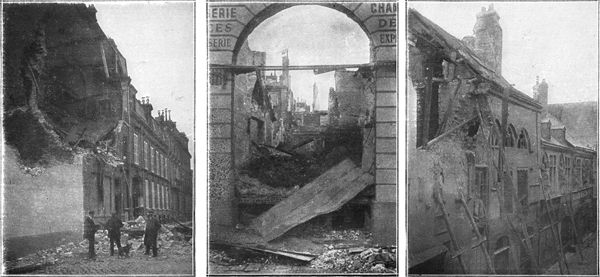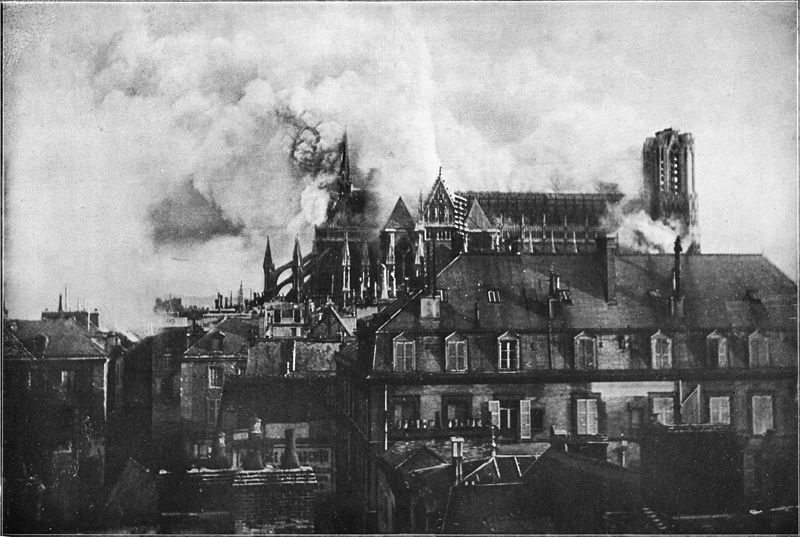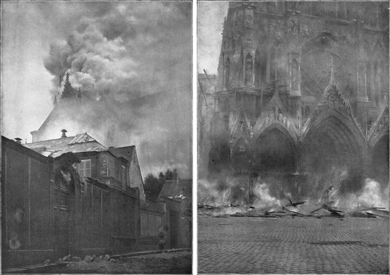 Lors du bombardement du 4 septembre, non seulement la cathédrale fut visée, puisque la ligne des rues et des édifices frappés s’étend, droite, en avant et en arrière de la basilique, non seulement deux obus qui ont éclaté à proximité endommagèrent, l’un d’admirables statues au grand portail, l’autre les vitraux de la basse nef Nord, mais encore un projectile est tombé directement sur le socle du pignon du transept Nord, saccageant l’architecture et les toits.
