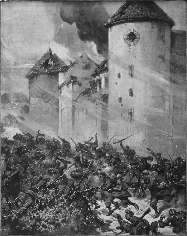 M. Frédéric Villiers, artiste correspondant de guerre de notre confrère anglais The Illustrated London News, a pu noter sur place un des épisodes les plus dramatiques de la bataille de la Marne. A 10 kilomètres de Sézanne, l’antique château de Mondement se dresse fièrement sur un mamelon d’où l’on domine les marais de Saint-Gond et la vaste plaine fermée au loin par la silhouette indécise de l’Argonne. L’importance stratégique de cette position était telle qu’au cours de la journée où s’effectua la retraite définitive des Allemands les deux armées se la disputèrent avec un acharnement extraordinaire. Nos troupes, qui l’occupaient d’abord, en furent délogées deux fois; fortement appuyées par l’artillerie, elles livrèrent un dernier assaut à la baïonnette, et, entrant par les fenêtres, trouvèrent le dîner servi pour les officiers allemands qui n’avaient point prévu ce retour offensif. Dans sa traduction exacte de ce que dut être la lutte, notre dessin fait revivre une de ces mêlées sauvages, héroïques, qui se livraient sous les donjons du moyen âge. L’incendie, les trous d’obus semblent peu de chose à côté d’un si terrible corps à corps, et cet épisode de la grande bataille est d’autant plus glorieux pour nos armes qu’on y vit la garde prussienne enfoncée par deux régiments de ligne, dont un de l’armée de réserve.