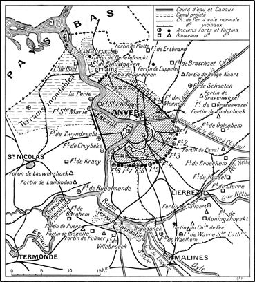 En Belgique, les opérations militaires se résument presque entièrement dans les attaques contre Anvers. Les Allemands déploient devant cette place un acharnement qui s’explique par le caractère de réduit suprême offert à la principale armée belge par le camp retranché. Ils n’ont peut-être ni les hommes ni le matériel nécessaires pour un siège régulier précédé d’un investissement. Le rayon défendu par les forts détachés les plus éloignés représente en effet un circuit de 100 kilomètres; il faudrait plusieurs armées pour opérer l’investissement. Aussi les Allemands s’efforcent-ils d’enlever un ou deux des forts extérieurs, de façon à atteindre la seconde ligne formée par les forts du général Brialmont.