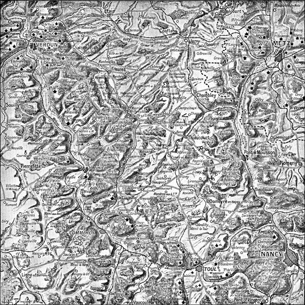 Nos forces montant du Sud à travers la plaine de Woëvre ont refoulé les éléments ennemis qui l’occupaient jusqu’au delà d’une ligne formée par la route de Commercy à Pont-à-Mousson; les avant-gardes atteignaient bientôt le village de Seicheprey, au cœur de la Woëvre; puis nos troupes descendaient dans la vallée du Rupt de Mad. Depuis lors, elles n’ont pas cessé d’avancer, assez lentement toutefois.