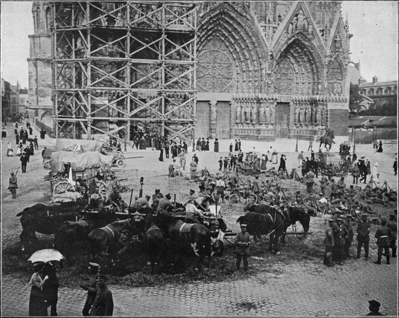 C’est le jeudi 17 que des blessés allemands—de 70 à 80—furent amenés à Notre-Dame. Les Allemands, le matin du jour qui vit leur retraite (12 septembre), avaient exigé un aménagement de la cathédrale permettant d’y installer 3.000 de leurs blessés, mais ils n’eurent pas le loisir d’en amener un seul. C’est l’autorité française qui fit utiliser, pour les blessés abandonnés à Reims par l’ennemi, la paille et les couvertures qui avaient été accumulées dans l’édifice. Le général Franchet d’Espérey prenait ainsi, pensait-il, alors que la ville souffrait, depuis trois jours déjà du bombardement, les garanties les meilleures pour la protection du monument.