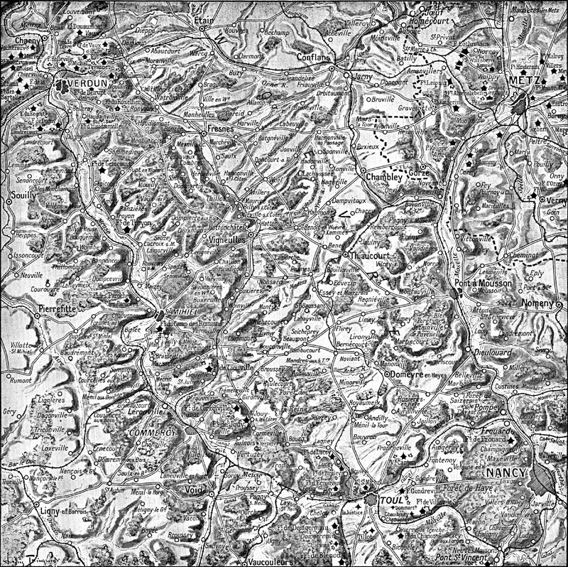 Sur la Meuse, des événements imparfaitement connus se sont produits; des forces allemandes venues de Metz ont voulu tendre la main à l’armée du kronprinz. Grâce à leur nombre, sans doute, à leur tactique de ruée furibonde, sans compter avec les pertes, les ennemis ont pu forcer les Hauts de Meuse dans leur partie la plus étroite et arriver à Saint-Mihiel, pour y tenter le passage de la Meuse. Ces efforts ont échoué, les ponts jetés par l’ennemi furent détruits, aucun élément n’a pu prendre pied sur la rive gauche. Pendant ce temps, des troupes françaises venaient du Sud, c’est-à-dire de la région de Toul et de Nancy, tandis que d’autres accouraient probablement des parages de Verdun, et la colonne allemande allongée entre Apremont-de-Woëvre et Saint-Mihiel se trouvait menacée.