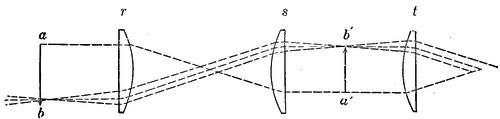 But his real contribution to optics was the terrestrial ocular. This as he made it is shown in Fig. 6 where a b is the image formed by the objective in front of the eye lens r, s and t two equal lenses separated by their focal lengths and a′ b′ the resultant reinverted image. This form remained in common use until improved by Dolland more than a century later.