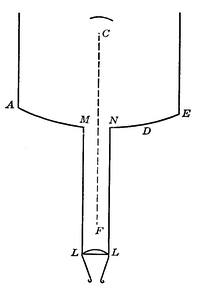 The necessary step forward was made by Johann Kepler (1571-1630), the immortal discoverer of the laws of planetary motion. In his Dioptrice (1611) he set forth the astronomical telescope, substantially, save for the changes brought by achromatism, as it has been used ever since. His arrangement was that of Fig. 5 in which the letters have the same significance as in Fig. 4.