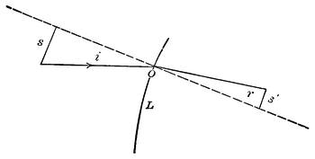[10] More recently his condition proves to be quite the exact equivalent of Abbé’s sine condition which states that the sine of the angle made with the optical axis by a ray entering the objective from a given axial point shall bear a uniform ratio to the sine of the corresponding angle of emergence, whatever the point of incidence. For parallel rays along the axis this reduces to the requirement that the sines of the angles of emergence shall be proportional to the respective distances of the incident rays from the axis.