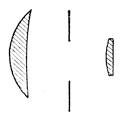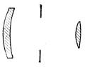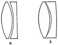 [12] The curvature of the image is the thing which sets a limit to shortening the relative focus, as already noted, for the astigmatic image surfaces as we have seen, fall rapidly apart away from the axis, and both curvatures are considerable. The tangential is the greater, corresponding roughly to a radius notably less than ⅓ the focal length, while the radial fits a radius of less than ⅔ this length with all ordinary glasses, given forms correcting the ordinary aberrations. The curves are concave towards the objective except in “anastigmats” and some objectives having bad aberrations otherwise. Their approximate curvatures assuming a semiangular aperture for an achromatic objective not over say 5°, have been shown to be, to focus unity
