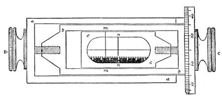 This shortly took the form of a genuine micrometer consisting of a pair of parallel blades in the focus, moved in opposite directions by a screw of duplex pitch, with a scale for whole revolutions, and a head divided into 100 parts for partial revolutions. With this he observed much from 1638 to 1643, measured the diameters of sun, moon and planets with a good degree of precision, and laid the foundations of modern micrometry. He was equipped by 1639 with what was then called a large telescope.