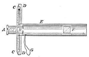 [5] In Fig 13, A is the support of the tube and focussing screw, B the main mirror, an inch in diameter, CD the oblique mirror, E the principal focus, F the eye lens, and G the member from which the oblique mirror is carried.