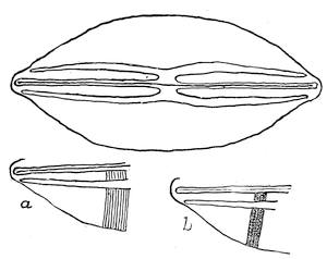 Nothing is more instructive in grasping the relation between resolving power, magnification, and the verity of detail, than the study under the microscope of some well known objects. For example, in Fig. 189 is shown a rough sketch of a common diatom, Navicula Lyra. The tiny siliceous valve appears thus under an objective of slightly insufficient resolving power. The general[Pg 272] form of the object is clearly perceived, as well as the central markings, standing boldly out in the form which suggests the specific name. No trace of any finer detail appears and no amount of dexterity in arranging the illumination or increase of magnifying power will show any more than here appears, the drawing being one actually made with the camera lucida, using an objective of numerical aperture just too small to resolve the details of the diatoms on this particular slide.