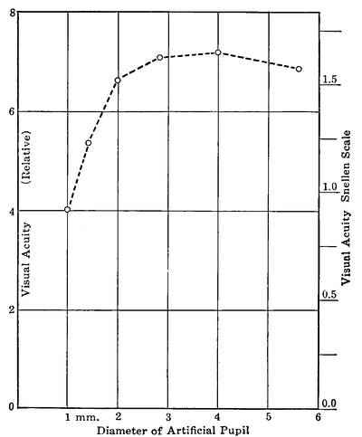 Figure 190 shows from Cobb’s experiments (Am. Jour. of Physiol., 35, 335) the effect of reduction of ocular aperture upon acuity. The curve shows very plainly that for emergent pencils below a millimeter (1/25 inch) in diameter, visual acuity falls off almost in direct proportion to the decreasing aperture. Below this figure there can be only incidental gains, such as may be due to opening up double stars and simultaneously so diminishing the general illumination as to render the margins of the star discs a little less conspicuous.