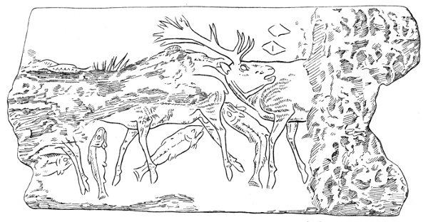 We can broadly distinguish in the Palæolithic epoch three (perhaps four) periods, separated by the occurrence of great extensions of the northern or arctic ice cap of such a volume as to cover North Europe and North America, and the simultaneous extension of the glaciers of the mountains of Europe. This period of the alternating extension and retreat of the great northern glaciers is known as the Glacial period, or Ice Age. The latest Palæolithic men are subsequent to it—that is, post-Glacial. We can distinguish several successive ages of these post-Glacial Palæolithic men, altogether distinct from and anterior to the Neolithic men. In the earlier of these ages many of the great animals of the Glacial period—now extinct or withdrawn to other regions—still survived [Pg 7] in Europe. The mammoth survived, but was fast dying out in the south and centre of France, and we find its outline scratched on ivory and on bone by the early post-Glacial men. The lion still survived in Europe, also the hyena, the bear and the rhinoceros. The reindeer seems to have been especially abundant, and to have been associated with the men of this period. The horse was very abundant, and was largely eaten by the earlier post-Glacial people. From the first these men show extraordinary artistic skill, and have left in their caves many carvings on ivory, bone and stone. In the oldest deposits of the post-Glacial age the carvings are complete all-round sculptures of small size or carvings in low relief, all of rough primitive workmanship. Larger life-size sculptures in rock are also found. In later deposits we find better sculpture and also engraving on flat pieces of bone and ivory, and also on stone. This art persisted, and attained its greatest perfection in the latest deposits of all in which the work of Palæolithic man is found. The reindeer persisted through this post-Glacial period (hence often called "the reindeer period") until the gradual increase of temperature and change of herbage and forest led to its migration northwards and to the relative abundance of the red deer. It is to this latest period—the Elapho-Tarandian of Piette—that the engraved antler figured here (Figs. 1 and 2) belongs.