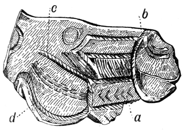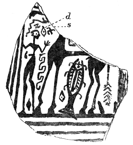 Attention has been drawn by Hörnes in his "History of Pictorial Art in Europe" to the resemblance of the Lortet picture to a fragment of a roughly painted vase of the Dipylon age (circa 800 B.C.) found at Tiryns and figured by Schliemann in his account of excavations made at that ancient Mykenæan fortress of the Peloponese. The fragment (Fig. 6) shows very roughly drawn figures of a man [Pg 24] and of a horse. Between the fore and hind legs of the horse a large elaborately ornate fish is represented, reminding us of the fishes between the deer's legs in the Lortet picture. Two other similar fragments of pottery, showing a fish in this position, are recorded by Schliemann. The drawing is conventional and careless. It is of a debased decorative character, and is very far removed from the careful nature-true work of the Lortet cave-man. It is not possible to trace by any known line of transmission a connection between the engraving executed 20,000 years ago in the caves of the Pyrénées and the figures rapidly knocked off in black paint on the Tiryns vase some 17,000 years later by the local dealers in cheap pottery. Yet we cannot avoid the suggestion that there is some connection between the two designs. For the Tiryns painting shows not only the curious upright fish between the horse's legs, but also diamond-shaped figures—one marked d in Fig. 6, another near the fish's tail, and another between the man's feet—closely resembling the pair of diamond-shaped figures engraved above the neck of the big stag in the Lortet picture (see Figs. 4 and 5). As we do not know what these diamond-shaped figures or "lozenges" are intended to signify in either case, we do not get, at present, beyond the bald fact of their coincidence. The Tiryns painting also shows (at s in Fig. 6) a "swastika" (see Chapter XVII), and below the man's arm a carelessly drawn bit of the ancient wave-fret or key-pattern. It is, of course, possible that the tradition of an ancient design—even dating so far back in origin as many thousands of years—may be preserved in the use made in the Tiryns decoration of the fish and the diamond-shaped lozenges, though associated with the swastika and the bit of wave-fret which are probably of later origin and are not known in the decorative work of the cave-men. The Mykenæan decorative assimilation of [Pg 25] geese to the ship's barnacle exercised its influence over three thousand years and led to the mediæval belief in the hatching of young geese from barnacles attached to floating timber, and even from the buds of trees (see my "Diversions of a Naturalist": Methuen, 1915). Nevertheless it must not be supposed that the connection of the Lortet engraving and the vase-painting of Tiryns is probable or more than a very remote possibility. The gap in time is too vast, and our present ignorance of what took place in that interval too complete, to warrant us in regarding the resemblance as more than a coincidence.