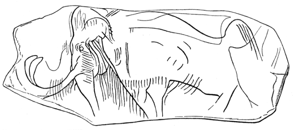 SOME fifty-five years ago pieces of reindeer's antler were discovered in the cave known as "La Madeleine" in the Dordogne (a department of France some eighty miles east of Bordeaux), upon which were engraved the outlines of various animals such as reindeer and horses. They and the bone spear-heads and needles, and the flint knives found with them, were the first revelation to later man of the existence of the prehistoric cave-men. Among the carvings was a piece of ivory which excited the profoundest interest. Partly hidden by a confused mass of scratches it showed the well-drawn outline of the great extinct elephant, thus scratched or "engraved" on a bit of its own tusk (Fig. 7). The engraving was barely 5 in. long, and has been reproduced in many books. The specimen is now in Paris, and was for long the only known representation of the Mammoth by the ancient men who lived with it in Western Europe.
