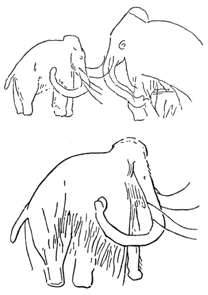 The illustrations in this chapter are (with the exception of Fig. 7) copies, greatly reduced in size, of faithful representations of the great hairy elephant or mammoth which still survived in southern France in the days when the caves were occupied and decorated by men. I am indebted to the valuable little book "Repertoire de l'Art Quatermaire," by M. Salomon Reinach, for these outlines carefully drawn by him from various large illustrations by the use of a tracing and reducing instrument. In the next chapter I have given examples from the same source of similar drawings of other animals.