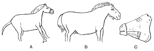 Our figures of the mammoth are (excepting Fig. 7) all of the fourth class—namely, rock-paintings in one colour (black or red) partly engraved and scraped. The originals are from 1-1/2 ft. to 2-1/2 ft. long. The mammoths given in Fig. 8 are carefully copied from engravings discovered, reproduced, and described by M. Breuil and his fellow-workers. They are on the walls of the cavern known as the "Font de Gaume," in the commune of Tayac in the Dordogne. Those copied in Fig. 9 and Fig. 10, A, were discovered on the walls of the cave of Les Combarelles in the same district.