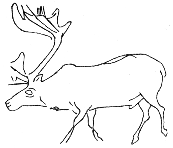 Leaving that question aside I have a few words to say as to the present attempted "completion" of the picture. My difficulty has been in realizing the suggestion of a free, graceful "bounding" action given by [Pg 18] the pair of small hind legs which form all that remains of the smallest of the three deer. I have tried various poses of the calf indicated by these legs—bucking and jumping, and with fore legs closely bent to the horizontal or in a more open position. The fact is there is very little in existing drawings or photographs which can help us to a decision of the problem, "How did the prehistoric artist complete that exquisite little pair of hanging legs?" The problem is more obscure even than that of the pose of the arms of the Venus of Melos. One feels sure that the man who made this carving was an artist who must keep a certain rhythm and flow in the action and form of the three successive animals, and it is clear that he was a wonderful observer of the phases of the limbs in movement. It is, perhaps, a presumptuous thing to attempt on such a basis to recall the thought of a man who died twenty thousand years ago, but I set out to do so with the belief that there is a necessary figure determined by those hind legs.