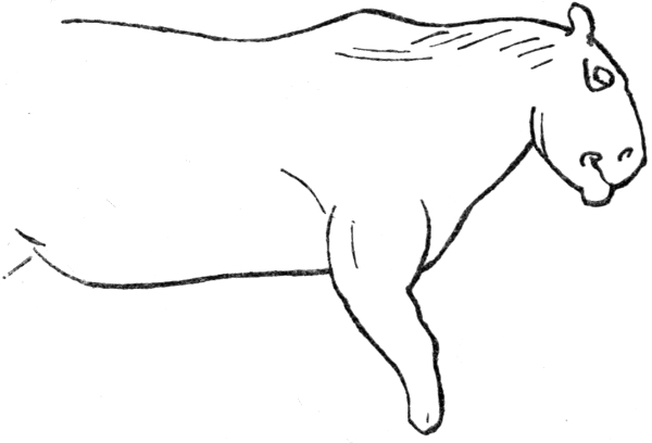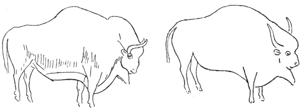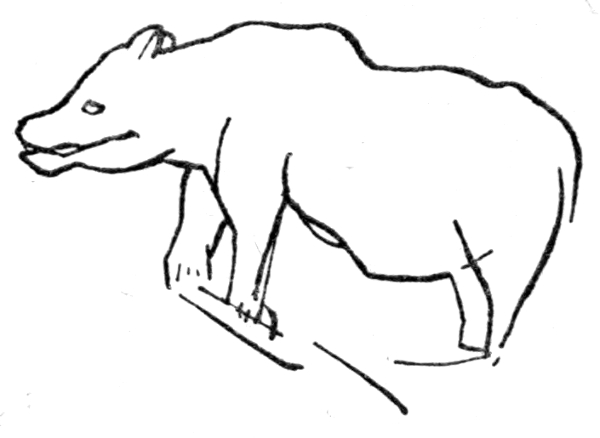 The bones and teeth of the mammoth are very common in the river gravels and clays of Western Europe and England, and a complete skull, with its tusks, dug up at Ilford, in the east of London, is in the Natural History Museum. Frozen carcasses of this animal are found in Northern Siberia, and two showing much of the skin and hair are in the museum of Petrograd. There is no tradition or knowledge of the mammoth among living races of men. The natives of Siberia, who have from time immemorial done a large trade in the ivory, regard the tusks as "horns," and have stories about the ghosts of the mammoth, but no tradition of it as a living beast. The mammoth was closer to the Indian elephant of to-day than to the African one. It had, as these drawings show, a pelt of long hair. Indian elephants from upland regions often have a good deal of hair all over the body: and the newborn young of both the Indian and African elephant has a complete coat of hair. The drawings here reproduced are not only of thrilling interest because they are the work of remotely [Pg 34] ancient men who lived with and observed mammoths in the south of France, but also because they show an extraordinary skill in "sketching"—in giving the essential lines of the creature portrayed and in reproducing the artist's "impression." These artists were "impressionists"—the earliest and most sincere—without self-consciousness or other purpose than that of making line and colour truly register and indicate their vivid impressions. It is interesting to note that (as in other works of art showing true artistic gift) actual error in drawing (for instance, in the size and shape of the eye and the placing of the two tusks on the same side of the trunk—possibly due to the unfinished state of the drawing) sometimes accompanies the most penetrating observation and skilful delineation of the characteristic form and pose of the animal. Probably mammoths were getting rare in the south of France when these drawings were made, and were not so familiar in all their details to the artist as were bison, horse, and deer.