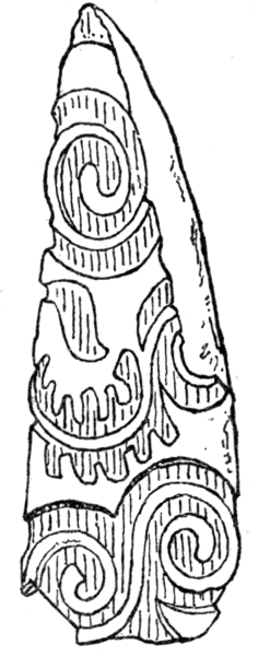 [7] But spiral and leaf-like decorative designs engraved on bone (see Fig. 29, p. 54) are found in caves associated with other carvings made by cave-men of the Reindeer or late Palæolithic period.