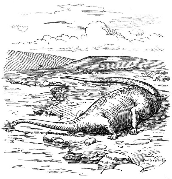THIS plate shows the restoration of the extinct lizard, Dimetrodon gigas (Cope), lately made by Mr. Charles W. Gilmore of the United States National Museum, by whose kind permission it is here reproduced from the Proceedings of the U.S. National Museum, vol. 56, 1919. It is based upon the study of a very fine skeleton and some hundred bones of allied species, collected by Mr. Sternberg from "the Permian formation" exposed in the vicinity of Seymour, Texas, U.S.A. It is selected for illustration here because its most striking feature—the high dorsal fin-like crest along the middle of the back formed by the elongation of the neural spines of the vertebræ—is a puzzle to the conscientious Darwinian. Professor Case says of it: "The elongate spines were useless, so far as I can imagine, and I have been puzzling over them for several years. It is impossible to conceive of them as useful either for defence or concealment, or in any other way than as a great burden to the creatures (terrestrial non-aquatic animals) that bore them. They must have been a nuisance in getting through the vegetation, and a great drain upon the creature's vitality, both to develop them and keep them in repair." The reader is referred to pp. 127, 128, where a brief discussion of such [Pg xii] exuberant growths will be found. The excessive growth of the median fins in the fish Pteraclis allied to the Dolphin which displays changing floods of surface colour as it dies—and in the Australian Blenny called Patæcus—both figured on p. 130—should be compared with that of the strange crest of the grotesque Dimetrodon.