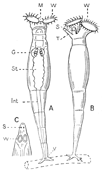 Many of the Rotifers have a pair of ruby-red eyes, and in some of them there is a minute crystalline lens overlying [Pg 171] the red sensitive spot, which receives the fibres of the optic nerve coming from the brain—one on each side. It is almost incredible that so minute a creature—often only the one-fiftieth of an inch long when full grown—should have a nervous system and special organs of touch (sensory hairs) as well as eyes, and on the other hand muscles running from one attachment to another and called into activity by nerves connected with this same central brain. The pair of branched tubes, which end internally in flickering "flame-cells" and open externally far back at the vent, are kidneys. Similar tubes called "nephridia" or little kidneys are found in many of the smaller animals; the earthworm has a pair in each ring of its body.