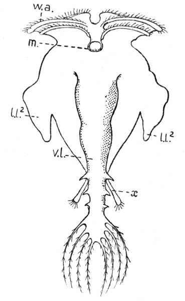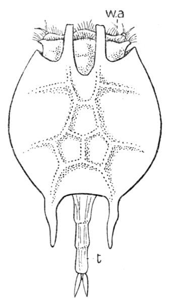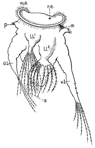 In some wheel animalcules there is a pair of these spurs, and the very remarkable wheel animalcule drawn in Figs. 35 and 36 has six large processes which, though much bigger, appear to be of the same nature. Of these four are seen in Fig. 35, namely, d.l., the dorsal limb, v.l., the great ventral limb, and l.l.1 and l.l.2, the two lateral limbs of the right side, all of them carrying fan-like groups of fringed hairs. They are moved by very powerful muscles, and strike the water with energetic strokes, so as to cause the little owner to dart through it. This jumping or darting wheel animalcule is called "Pedalion," and was discovered and described by Dr. Hudson. It is so astonishing and wonderful a little beast, that when Dr. Hudson sent me some alive in a tube by post in 1872, [Pg 162] soon after he had discovered it, I could not believe my eyes, and thought I must be dreaming. It is very like the young form of Crustaceans known as a "Nauplius" (see tail-piece to the present chapter) in having (what no other wheel animalcule has) great hollow paired limbs moved by striated muscular fibre, carrying fringed hairs only known before in Crustaceans (crabs, shrimps and water fleas), and striking the water violently just as do those of the Nauplius. And yet all the while it has on its head a pair of large ciliated wheels which serve it just as do those of the common Rotifer. No Crustacean, young or old, has this "wheel-apparatus" nor any vibratile "cilia" on the surface of its body. Pedalion possesses an astounding "blend" of characters. Fig. 35 shows, besides the "paddles" or "legs" (of which two on the other side of the animal are not seen), the broad and large wheel-apparatus W (within which the right eye-spot r.e. is seen), and a little lobe (p) called the "chin" lying just below the mouth (m). The big leg (v.l.) and the pair on each [Pg 163] side (l.l.1 and l.l.2), of which that on the right side only is seen, end in beautiful fringed hairs, which are only seen elsewhere in the Crustacea (water-fleas and others). Those on the lateral limbs and the great ventral limb (Fig. 36) are set in two groups of four on each side of the free end of the limb, whilst those on the dorsal leg (d.l.) are apparently not so numerous. I have corrected the drawings, Figs. 35 and 36, by reference to actual specimens kindly given to me by Mr. Rousselet.