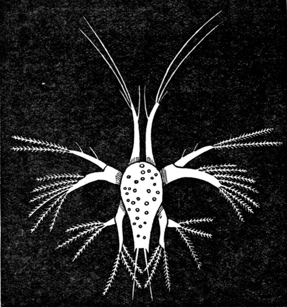 The Rotifers are so small that they are built up of very few "cells" or nucleated units of protoplasm. Many of them are of smaller size than some of the big infusorian animalcules, which consist of a single cell. The Rotifers are probably a dwindled pygmy race descended from ancestors of ten or a hundred times their linear measurement. [Pg 172] It is an important fact that in the possession of a toothed gizzard, in the hard body-case or cuirass of some kinds, and in Pedalion's rapidly-moving legs or paddles, fringed with plumose hairs and moved by that peculiar variety of muscular tissue which is called "striped muscular tissue," the wheel animalcules give evidence of relationship to the Crustacea—that is to say, it appears to be probable that they were derived from the common ancestor of marine worms and Crustacea before those two lines of descent had diverged.