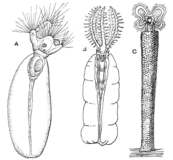 Rotifera or wheel animalcules are found all over the world, in the tropics, the temperate zones, the Arctic and Antarctic, and many species have a world-wide distribution. They occur in fresh waters and in the sea, in great lakes, in gutters which dry up, in pools in the polar regions and on high mountains which are solid ice for the greater part of the year. A few are parasitic, some living on the legs of minute Crustacea. One which I discovered in 1868 in the Channel Islands lives in crowds on the skin of a remarkable sea-worm (Synapta), which burrows in the sand, exposed at low tide. It holds on (as I found and figured) by a true sucker, which replaces the forked tail of other commoner Rotifers. It was named "Discopus" by Zelinka, who searched for it in consequence of my description, and gave a very detailed account of it. Others are parasitic inside earthworms, and one is found inside the globe animalcule Volvox! Another causes the growth of warts or "galls" in a curious kind of Alga called Vaucheria.