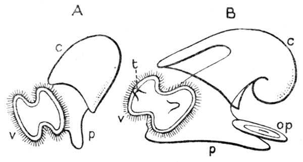 The various internal organs of a Rotifer are readily seen through its transparent skin (Fig. 34, A). It has a nervous system, many bands of contractile muscles and a pair of little tubular kidneys or nephridia, besides reproductive germs (the eggs). I have here sketched only the digestive canal. The mouth leads through a gullet to a very curious organ called the "gizzard," marked G. All the wheel animalcules have this gizzard, but its teeth, shown as two oval bodies in the drawing, differ a great deal in shape and complexity in the different kinds. Whilst the Rotifer is feeding by bringing currents of water to its mouth, the two halves of the gizzard are kept in rapid movement by muscles, causing them to rub against one another and to grind up the food particles which reach them through the gullet. The gizzard (G) is followed by the digestive stomach (St), and that by the intestine (Int), which opens at the vent (V). The side (or three-quarter profile) view of a similar specimen (Fig. 34, B) shows only the surface of the little animal, and is intended to show especially the snout-like head-lobe (S), with its two eye-spots, which are red in colour. Standing out backwards from this is a finger-like process (T), which is called the spur, or tentacle. It has hairs at its tip, and is a sensory organ.