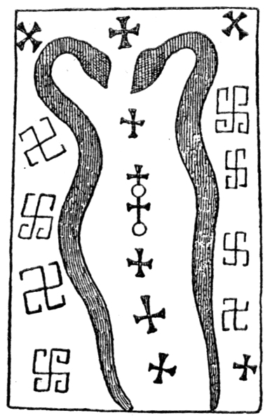 When we take account of the apparently arbitrary passage of human decorative design from the naturalistic to the linear, and from the linear to the naturalistic; from the curvilinear to the rectilinear, and from rectilinear to curvilinear; when we also reflect that some races and populations of men have been prone to seek for the forms of their decoration in the natural forms of plants and animals, whilst others have made use of mere mechanical patterns of parallel or interlacing lines, we must conclude that by the appeal to one or other of these various tendencies it is easy to invent a large variety of more or less plausible theories as to the origin of the Swastika. The truth of the matter can only be decided, if ever, by more direct and conclusive evidence than we at present possess. Nevertheless, it is a legitimate and fascinating thing to speculate on the origin of this wonderful world-pervading emblem coming to us from the mists of prehistoric ages, and to endeavour to arrive, if possible, at possible points of contact between it and other "devices" and "symbols," even though they may be of equally obscure birth. [8]