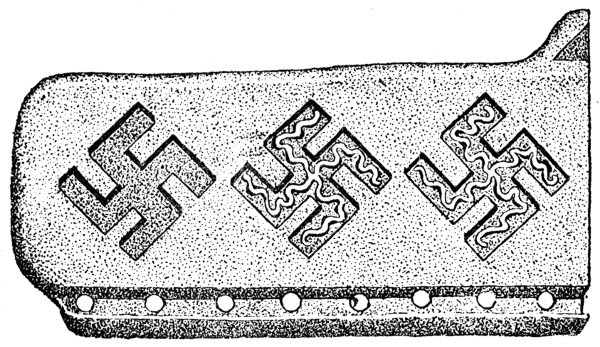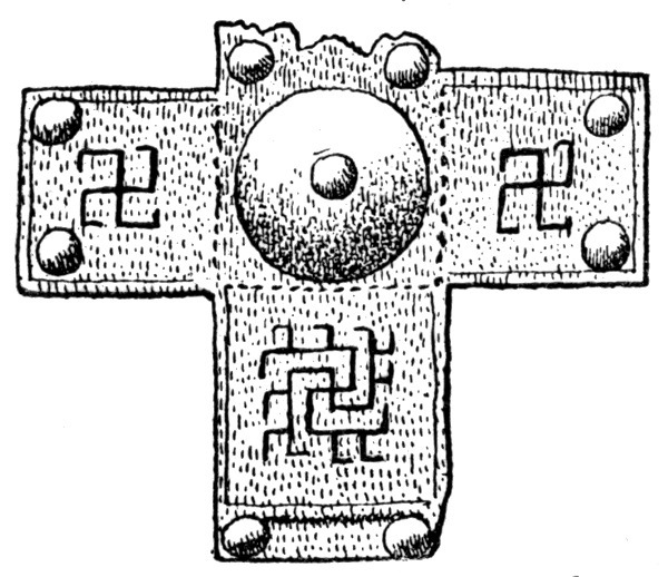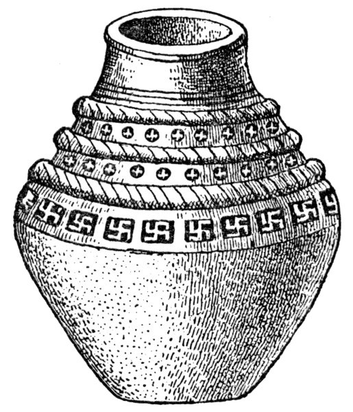 The Mykenæans and their island relatives obtained the Swastika either from the ancient Bronze-age people of Europe or else gave it to them, since it is very nearly as common as a decoration or symbol on the bronze swords, spear-heads, shields, and other metal work of these prehistoric people of the middle and north of Europe (also occurring in the pottery of the Swiss Lake dwellings), as it is in the islands and adjacent lands of the Eastern Mediterranean. The Swastika is also found abundantly on the early work of the Etruscans, but disappeared from general use in Italy, as it did from the rest of Europe, before historic times, although occasionally used (as in the decoration of the walls of a house at Pompeii). All over Germany, Scandinavia, France, and Britain it is found (Fig. 44) on objects of the Bronze period—sometimes on stone as well as on bronze utensils, ornaments, and weapons. A few objects of Anglo-Saxon age are ornamented with it—especially remarkable is a piece of pottery of that age from Norfolk (Fig. 45).