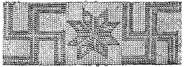 The history of the "Swastika" would be remarkable enough if it ended here with the disappearance of its use in Europe in prehistoric times and its continued use in the Far East and India. But the most curious fact about it is that we find it as a very common and favourite decoration and device among the native tribes in North America and Mexico, and exceptionally in Brazil. It is [Pg 196] found in use among the Indians of Kansas and other tribes—as a device in pottery, in bead-work (Fig. 46), patch-work, quill-embroidery, and other decorative fabrics. The Indians called Sacs, Kickapoos, and Pottawottamies, [Pg 197] who worship the sun (which is associated with the Swastika in China), call it by a native name signifying "the luck." It is also found as a decorative design in the most ancient remains of man in America, dating (so far as can be guessed) from a thousand years or more before Columbus (Fig. 47).