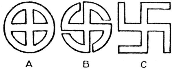 A method of making the Swastika by piling up sand or grain on a flat surface, actually in use at the present time in India, is shown in Fig. 48. The artist makes first of all a circle with a cross drawn within it (A). Then the circle is rubbed out or cut away at four corresponding points where the arms of the cross touch [Pg 199] the circle, and so we get B. Then by the straightening of the curved pieces we get the correct rectangular Swastika, C. It is not probable that this is the way in which the Swastika was originally devised, though it is not possible to arrive at any certainty on the subject.