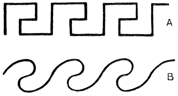 The contrast is well shown in the two renderings of one and the same "pattern," shown in A and B of Fig. 49. A is the rectilinear angular decorative design which is known as the "Greek key pattern," whilst the scroll below it is the "curvilinear" treatment of the same subject. The first takes its rectilinear character from a structure built up of hard blocklike pieces; the other is the flowing, easily moving line of a brush laying on paint, or of a style moving over clay or soft wax. The contrast is the same as that of the capital letters of the Roman alphabet, as used in print, with their equivalents in "copper-plate," cursive handwriting.