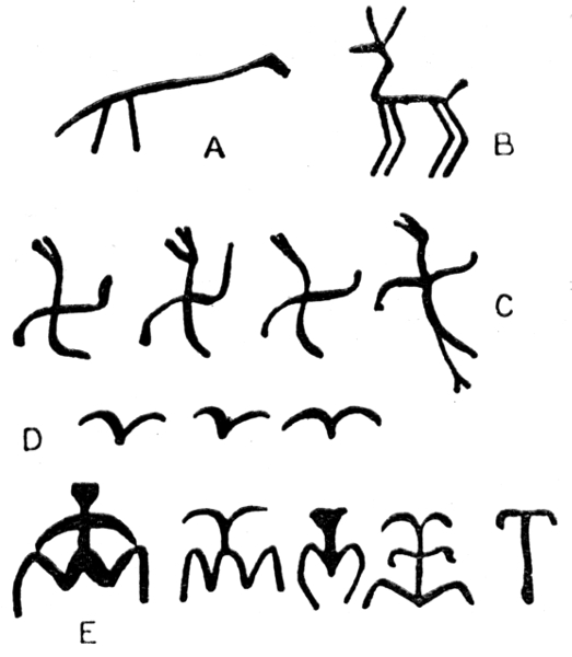 Familiar modern examples of this reduction of an animal figure to one or two lines, with mysterious-looking branches (representing limbs or horns), are seen in the scattered devices on the Turkey carpets so largely used at the present day. A comparison of various examples of such carpets of different age and locality reveals the true nature of these queer-looking patterns as representations of animals! Another familiar instance of the grammatizing of an animal form is that shown in Fig. 52, D, which is the common symbol in modern European art for a flying bird. Fig. 52 shows, however, some more important simplifications of animal form. The series marked E are a few examples from hundreds painted on the walls of caves in Cantabria (Spain) by prehistoric men. They [Pg 206] start with a clearly recognizable figure of a man—many such, an inch or two high, occur on some parts of the cave-walls—and then we have all sorts of simplifications and deviations from the more naturalistic initial design, as shown by the rest of the series, ending in a T—a primitive symbol often arrived at by savage decorative artists in various parts of the world by reducing and grammatizing the human figure. The letters of many alphabets have been simplified in this way from original picture-like signs or pictographs.