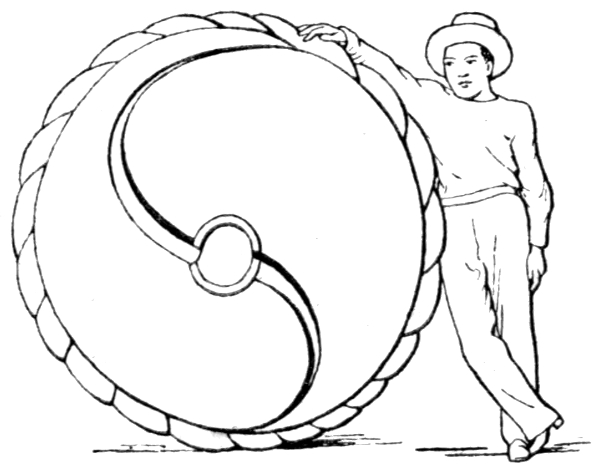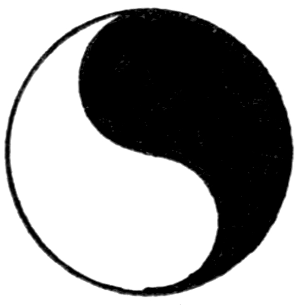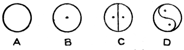FIG. 54 represents a remarkable design which is a sort of national emblem, a universally accepted badge of triumph and honour in Japan, and is called "Tomoye"—meaning "triumph." The black and white portions are in that country painted respectively red and yellow. It is simply a circle divided into two equal cone-like figures by the inscription within it of a doubly-curved line like the letter S. Where and how did the Japanese get this badge? Who invented it, or from what natural object is it copied? A modified Tomoye with the cones dislocated is used as the national flag of Korea. A single one of these curious, tapering, one-sided cones is closely similar to the cone-like figures sometimes called "pines" which one sees on Indian shawls. The origin of these is sometimes said to be a copying of some fruit or vegetable growth, but is really not ascertained—and is possibly half of a Tomoye! A great circular altar-stone has been found in Central America, 5 ft. across, divided by a deep S-shaped groove into two equal one-sided cones (Fig. 59) like the Tomoye. The figure formed by an S within a circle is found in the writings of the ancient Chinese philosopher Chu-Hsi. He gives a series of symbols representing [Pg 210] (according to him) the history of the universe. They are shown in Fig. 55, and are explained as follows. The empty circle A represents the original "void"—the boundary line is conventional. After untold æons the great monad appeared. It is represented by B. Then we get the division of the great monad (now called "Tai-I") into two, shown in C of our Fig. 55—singularly recalling the division of the nucleated cell or protoplasmic unit of animal and vegetable structure. The two halves, however, in this case represent the feminine called "Yin" and the masculine called "Yang." The last drawing, D of Fig. 55, shows the Yin and the Yang in rotatory motion. This is indicated by the S-like bending of the diameter, and the consequent formation of a figure like the Tomoye. By this motion the visible universe is supposed—by the philosopher Chu-Hsi—to be produced. The figure marked D is described as a "cosmological symbol." It does not help us to the origin of the figure showing [Pg 211] the division of the circle as in the Tomoye, for it dates only from about the twelfth century of our era.