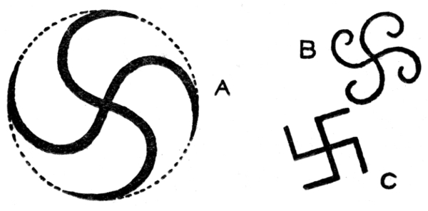 A GOOD many people have never heard of the Swastika. It is an emblem or device such as is the Cross or the Crescent. Here it is (Fig. 38) in its most simple and most common form. In India it is in common use at the present day, and has been so for ages. It is the emblem of good luck. The name "Swastika," by which it is widely known, is a Sanskrit word meaning "good luck." The word is composed of Su, the equivalent of the Greek eu, signifying "well" or "good," and asti (like the Greek esto), signifying "being," whilst ka is a suffix completing the word as a substantive. The sign or emblem called Swastika must have existed and been largely used in decoration of temples, images, swords, banners, utensils, and personal trinkets of all sorts long before this name was given to it. It has a name in many widely separate languages. It is often referred to by English writers as the fylfot, the gammadion, and the "crux ansata," also as the "croix gammée." It is often found more roughly drawn (on pottery or cloth) as shown in Fig. 39. Often the arms of the cross are bent rigidly at right angles as in Fig. 38, but they are often only curved as seen in Fig. 39, C, [Pg 192] or curled spirally as in B, when it is called an "ogee." The arms of the Swastika are sometimes bent to the right as in Fig. 38, and sometimes to the left as in Fig. 39. This difference does not appear to have any symbolic significance, but to depend on the fancy of the artist.