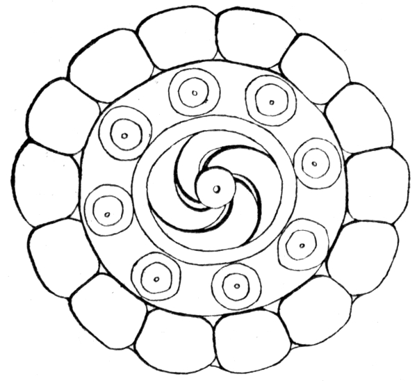 We find in early work discovered in the ancient mounds of North America decorative circles (Fig. 58) in which two S-like lines at right angles to one another are inscribed as shown in Fig. 56, and we find also that these curved rays may be prolonged as a marvellous enveloping [Pg 212] spiral coil or helix—especially in the painting of pottery. When the curved rays are many in number, as in Fig. 57, the design has been interpreted by some archæologists as symbolizing the sun, and it is important to remember that the Swastika itself was used in China as the pictograph of the sun. A single curved S-like line has been found cut on a great circular slab, an ancient altar-stone (Fig. 59) in Honduras (Copan)—so as to divide the circle as is done in the Japanese Tomoye. It is obvious that the exact geometric character of the S-like division is of great significance in these designs and requires careful study and explanation. I have briefly discussed this matter at the end of the chapter. In the common "ogee Swastika," Fig. 56, B, the more or less elaborately helicoid arms are merely careless flourishes of the painter's brush. The simple four-rayed figure, shown in Fig. 56, A, is often spoken of as a "tetraskelion," or four-legged scroll, and is associated with the three-legged figure or triskelion which I wrote of in the last chapter. If the curvilinear "tetraskelion" be angularized—that is to say, rectangles substituted for semicircles, we get the correct fully developed Swastika, Fig. 56, C. And if, abandoning the circle, the draughtsman rapidly drew with a brush or on soft clay lines like [Pg 213] an S crossing one another at right angles, he produced what is common enough wherever the more formal rectangular Swastika is found, namely, the curvilinear or "ogee Swastika," Fig. 56, B.