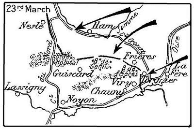In February 1918, the British positions extended in front of the Hindenburg Line, as far as the village of Barisis, opposite the Forest of St. Gobain, to the south of the Oise. Three successive positions, widely separated from one another, had been actively strengthened. Moreover, the water-lines of the marshy valley of the Oise, the Crozat Canal, the loop in the Somme, and the North Canal, formed so many natural obstacles.