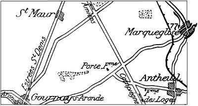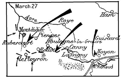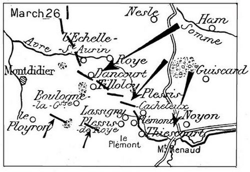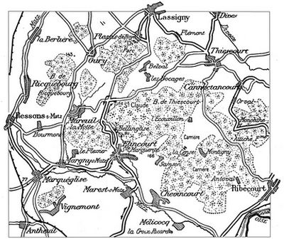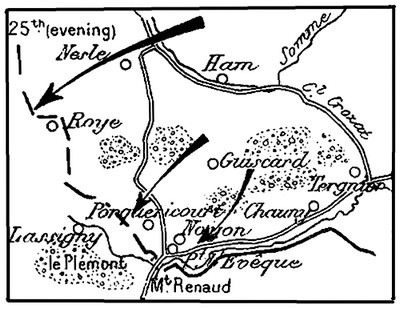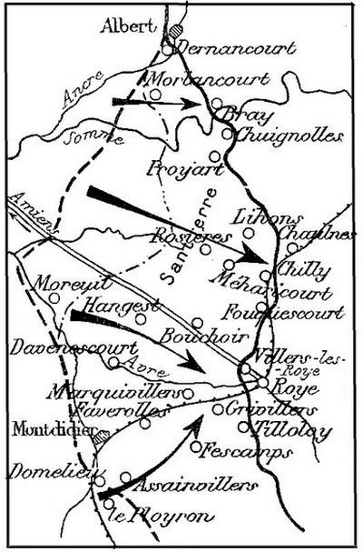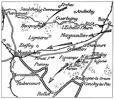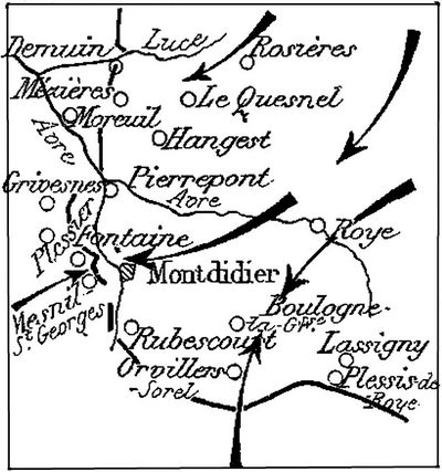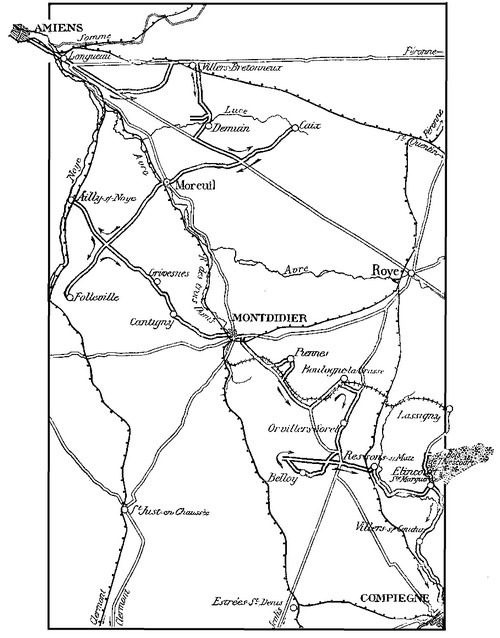 The Picardian Plain, with its broad and gentle undulations, dotted here and there with small woods, is closed, on the south, near the valley of the Oise, by the wooded hills of Genlis, Frières and La Cave, and to the west of the bend in the Oise, by the hills of Porquericourt and the wooded massif of Le Plémont, with its promontory, Mount Renaud, to the south of Noyon. Further west, the high ground of Boulogne-la-Grasse does not close the Plain of Santerre, which, between the slopes of Le Plémont and Montdidier, communicates freely with the Plain of Ile-de-France. The enclosed and wooded valleys of the rivers Avre, Trois-Doms and Luce intersect the tablelands of Santerre. Further north, stretches the old battlefield of 1916,—a chaotic waste of winding trenches and barbed wire entanglements.