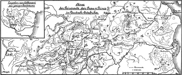 Nach einem kurzen Aufenthalt in Dar-es-Salaam, wo mir von allen Seiten mit der größten und freundlichsten Fürsorge begegnet wurde, erhielt mein Mann den Befehl, die Station Perondo zu übernehmen, die an der Grenze von Uhehe neu gegründet war.[S. 4] Von dort aus sollte er die friedliche Unterwerfung des Volks der Wahehe weiter fördern. Nähere Kunde über die Station wie über die augenblickliche Stimmung Quawas und seiner Wahehe war aber zunächst nicht zu erhalten, denn die letzten Berichte waren infolge der Überschwemmungen im Inneren des Landes noch nicht zur Küste gelangt. Daß der verheißungsvolle Name Dar-es-Salaam, Hafen des Friedens, den wir bei unserer Einfahrt in die prachtvolle Bucht als günstiges Vorzeichen begrüßten, in Wahrheit nur geographische Bedeutung für uns haben sollte, ahnten wir freilich nicht, als wir hoffnungsvoll den Marsch nach der Stätte unseres Wirkens antraten.