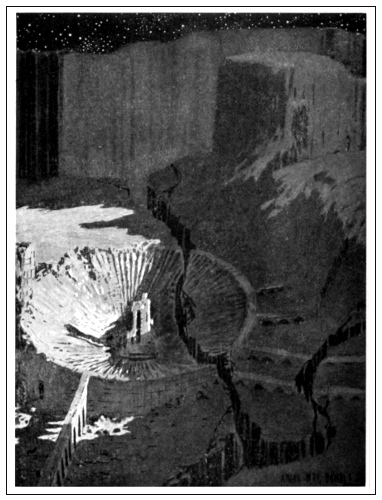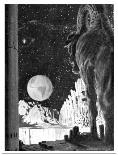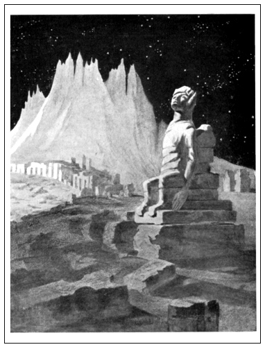 The story was simply told. He started at night for the red planet. He got there and he landed. The air seemed much like ours. But he found himself in a world quite different from his own. All was architecture; temples, towers and enormous viaducts fading away into the horizon, as far as the eye could see. And everything was tall and slender. The trees were very high with branches pointing upward like poplars, and always formally laid out in avenues, or in geometric patterns. And the color! It was like looking at an endless city through orange glasses. The few people he saw had larger heads than ours, more like children, but like children with very short legs. They were surprisingly light on their feet. He was surprised at their high jumps until he remembered that a man who weighs two hundred pounds on the earth weighs but seventy-five pounds on Mars. He really saw but little, however, for although he had tested the atmosphere he[296] found, after looking about him a moment, that the air, while pleasant enough to breath, was affecting his nerves and brain, almost like laughing gas. Then, as he stood there, and began to realize his danger, the wonderful thing happened!