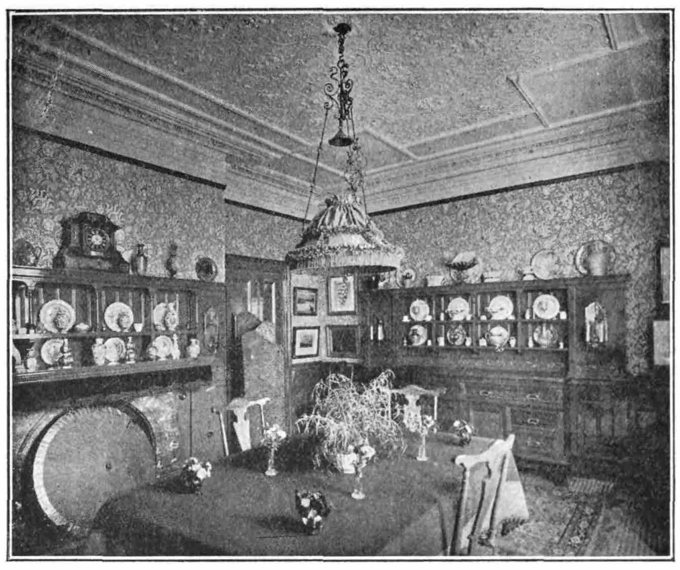 But let not the very smallest householder that exists allow herself to have gas in her sitting-rooms on any account at all, neither let her condescend to keep above her head the hideous centre-piece in plaster work which is always provided for house-owners save in the more artistic (and more draughty) houses which have panelled ceilings, the plaster part of which should be{125} coloured cream, and the panels themselves filled in with anaglypta, or else with ordinary ceiling paper judiciously arranged. The plaster rose can be removed in a moment, and replaced by a hook from which a good duplex lamp from Benson & Company in New Bond Street, should be hung, with either a pierced copper or opal glass shade, and this gives light enough for any ordinary occasion; extraordinary ones can have extra light from candles placed on the buffets or sideboard, and in sconces on the mantel and over-mantel, as shown in sketch, the duplex lamp being lighted or not as the mistress likes much or little light, or possesses, as she may possibly possess, branched silver candlesticks, or the equally beautiful Sheffield plated ones which she can place on her table on very grand occasions.