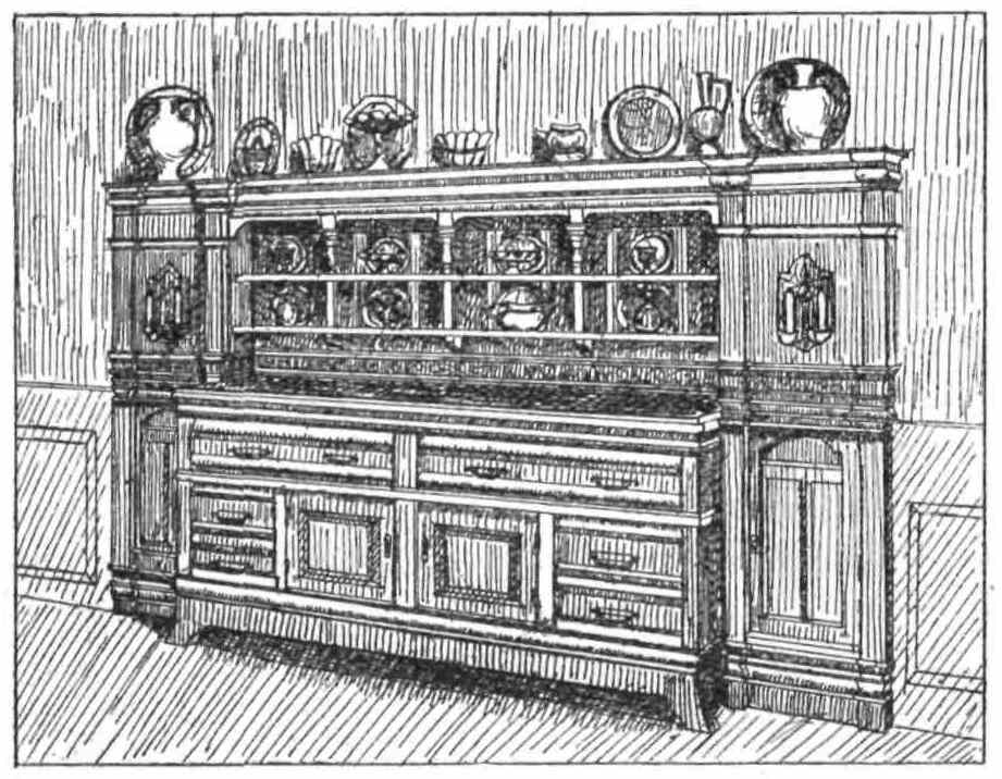 be made by any amateur carpenter and are in any case much better possessions than the dreary, little, badly-made sideboard one finds all too often in far too many suburban residences. These sideboards are machine-made and are cheap and nasty, generally coming to pieces after the first fires have been lighted and always smelling of varnish, and looking more depressing than I can say. If the wall be recessless, and long and hopelessly flat, we should have a good buffet-sideboard in the centre of the wall, in either some good brown wood, or else in my pet stained{121}
